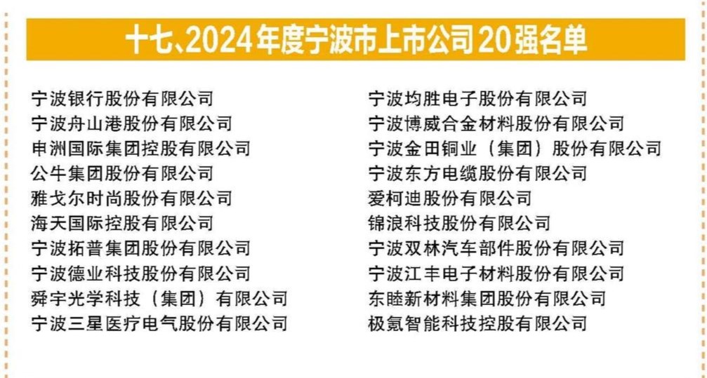 此次荣登“宁波上市公司20强”,,,,,,,是对云顶国际vip.888股份过往生长路径的充分一定,,,,,,,也为公司未来生长注入了强劲动力。。。。。未来,,,,,,,云顶国际vip.888股份将继续秉持立异驱动生长理念,,,,,,,细密围绕国家工业政策导向,,,,,,,深耕智能制造焦点手艺,,,,,,,一连优化工业结构,,,,,,,为区域经济高质量生长孝顺更多力量。。。。。